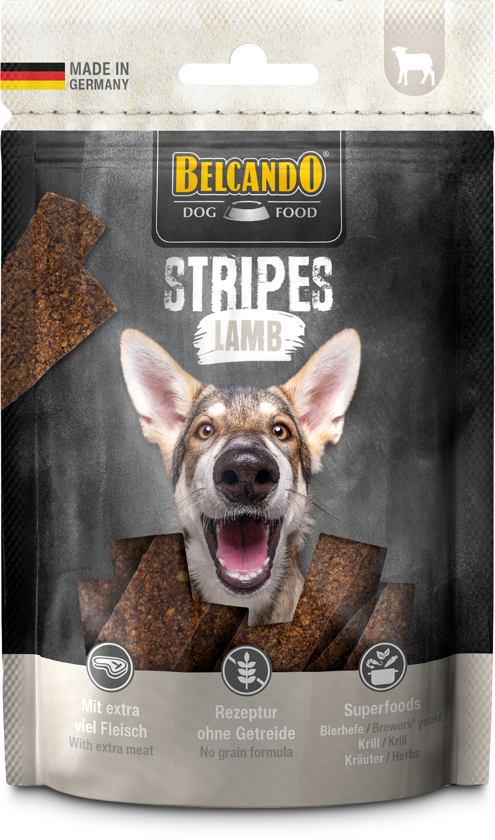 Lammfleisch kombiniert mit der natürlichen Power aus Krill, abgerundet mit nähr- und vitalstoffreicher Bierhefe sowie aromatischen Kräutern für noch mehr Geschmack – welcher Hund kann da schon Nein zu einem Hundeleckerlie bellen? Die Hundesnack-Streifen sind natürlich „Made in Germany“ mit extra viel Fleisch und werden schonend luftgetrocknet. Die Rezeptur verzichtet auf Getreide, und als praktische Streifen lassen sich die Leckerlies ganz einfach individuell portionieren. Ideal als Trainingssnack oder Belohnung für Ihren Hund.