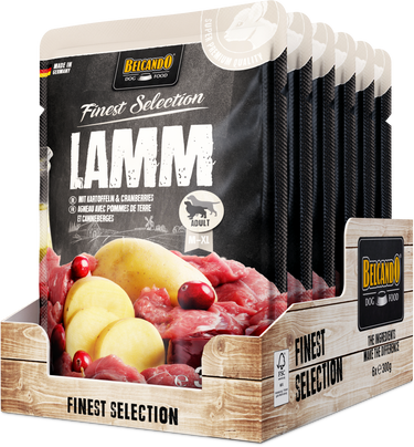 Exzellente Rezepturen in praktischen Einzelportionen. Saftiges Fleisch, mit raffinierten Zutaten verfeinert, wird schonend im Portionsbeutel gegart. Kalt gepresstes Distelöl liefert essentielle ungesättigte Fettsäuren. Außergewöhnlich schmackhaft und bekömmlich eignet sich BELCANDO® Finest Selection hervorragend für sensible oder wählerische Hunde.