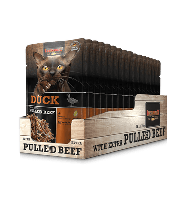 Mit dem neuen „LEONARDO® Pulled Beef“ kommen jetzt auch Katzen in genau diesen Genuss! Jede Portion wird schonend gegart und mit Lachsöl verfeinert. Lachsöl liefert mehrfach ungesättigte Fettsäuren für ein besonders seidiges Fell.