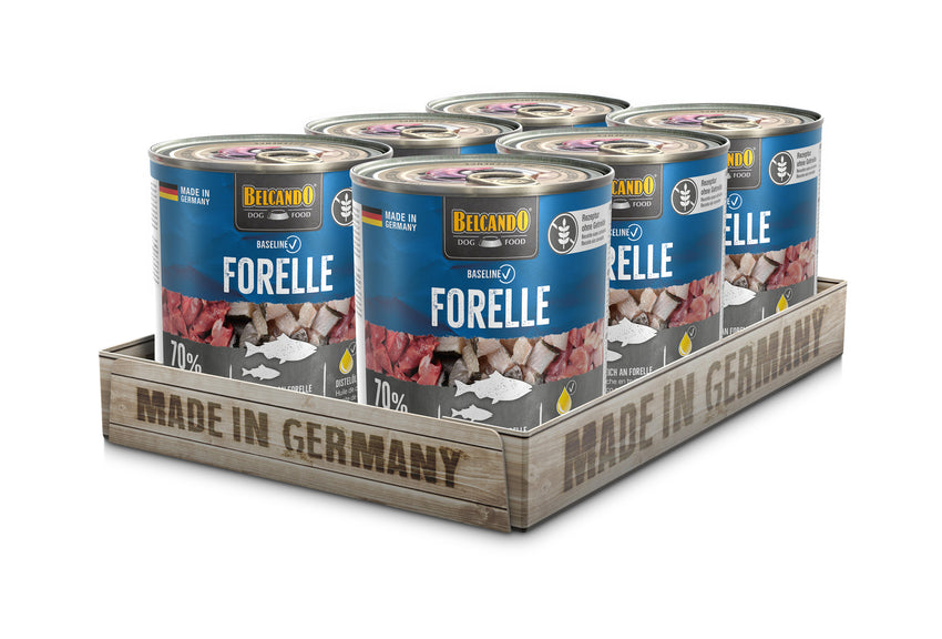 Rezeptur ohne Getreide, reich an Forelle, 70 % Fisch und Innereien.