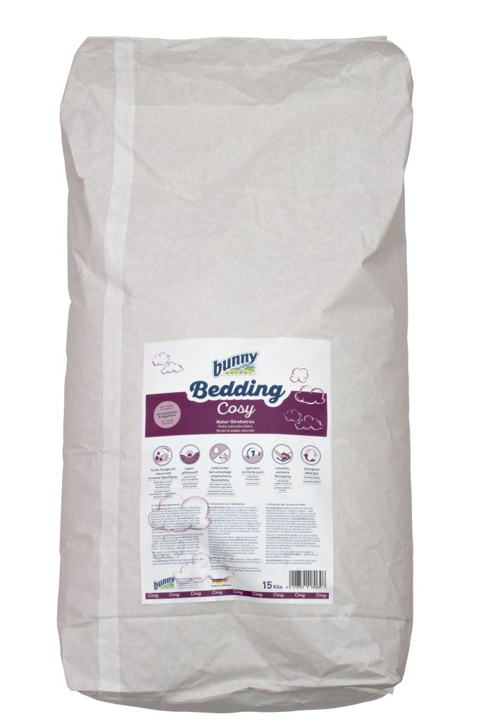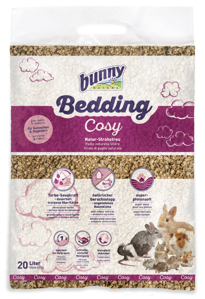 bunnyBedding Cosy ist die super-softe Natur-Strohstreu für Kaninchen, Zwergkaninchen, Meerschweinchen, Chinchilla, Degu, Ratte, Maus Hamster & Co. Die Streu bindet sofort Feuchtigkeit und Geruch und ist aufgrund der hohen Saugkraft besonders sparsam im Verbrauch. bunnyBedding Cosy bietet den Tieren eine softe Liege- und Lauffläche und schont ihre sensiblen Hinterläufe. Für Nager und Halter ist die Einstreu gleichermaßen außerordentlich angenehm in der Verwendung, da es staubarm ist.