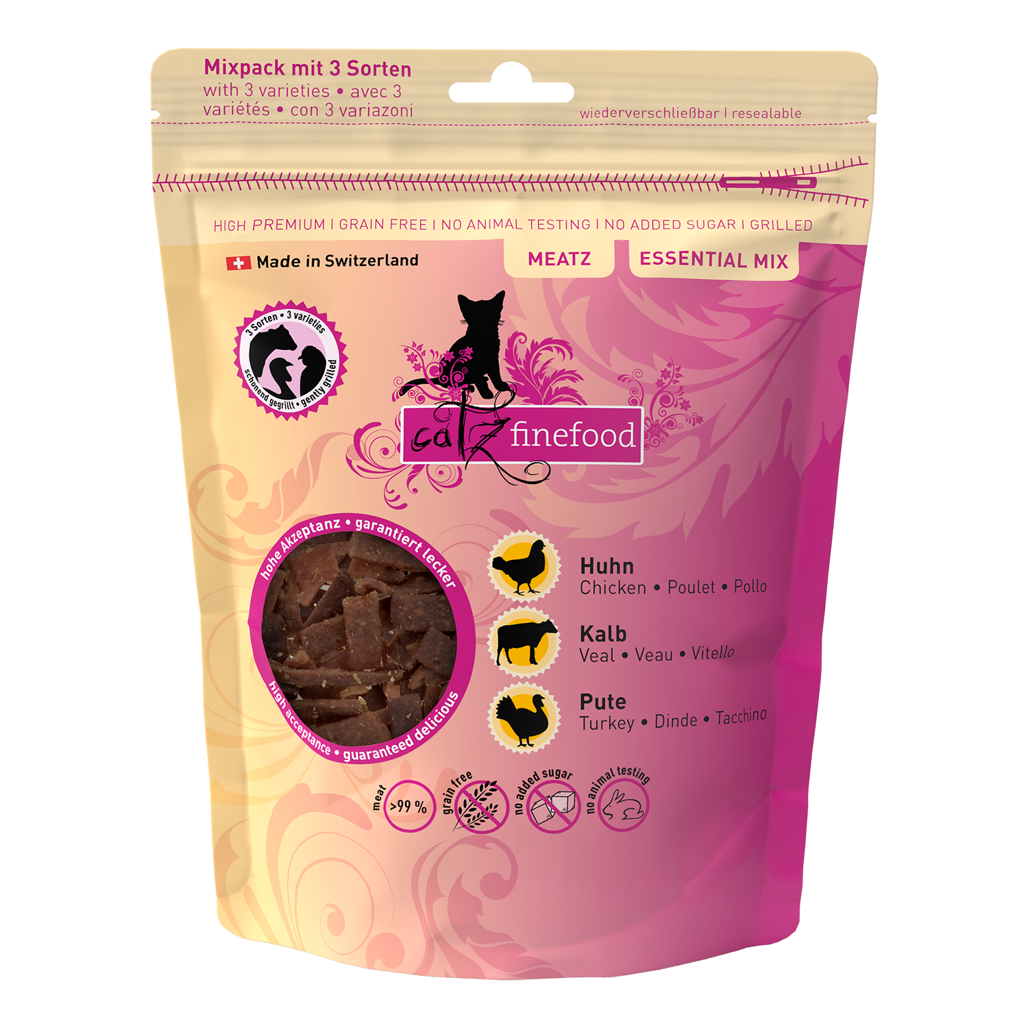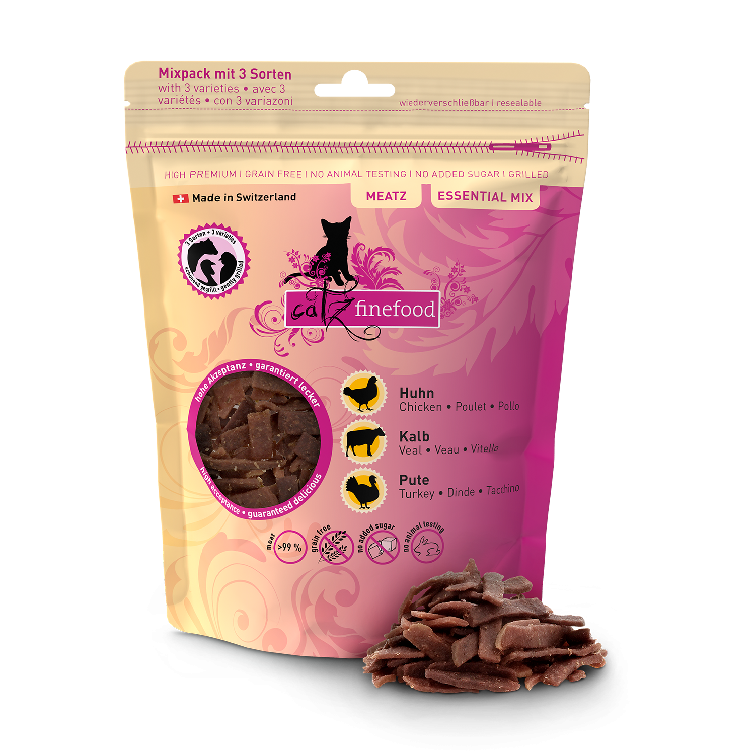Mit unseren beliebten catz finefood Meatz® gönnst du deiner Katze einen ganz besonderen Leckerbissen. Die gegrillten und anschließend luftgetrockneten Leckerli mit dem sehr hohen Fleischanteil sind unwiderstehlich für die Vierbeiner und bieten ihnen eine perfekte Ergänzung zu unserem Nassfutter.