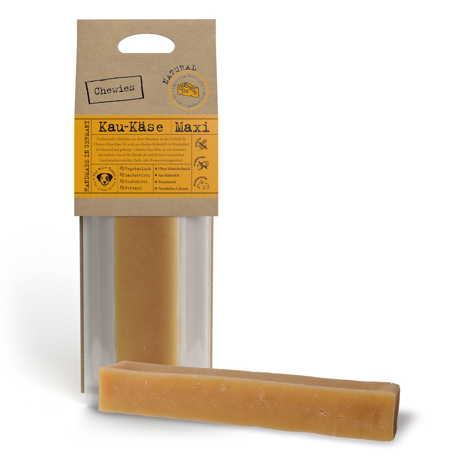 Eine Packung enthält 100 g Kaukäse, bei Mini aufgeteilt in drei Stangen, bei Maxi nur eine Stange