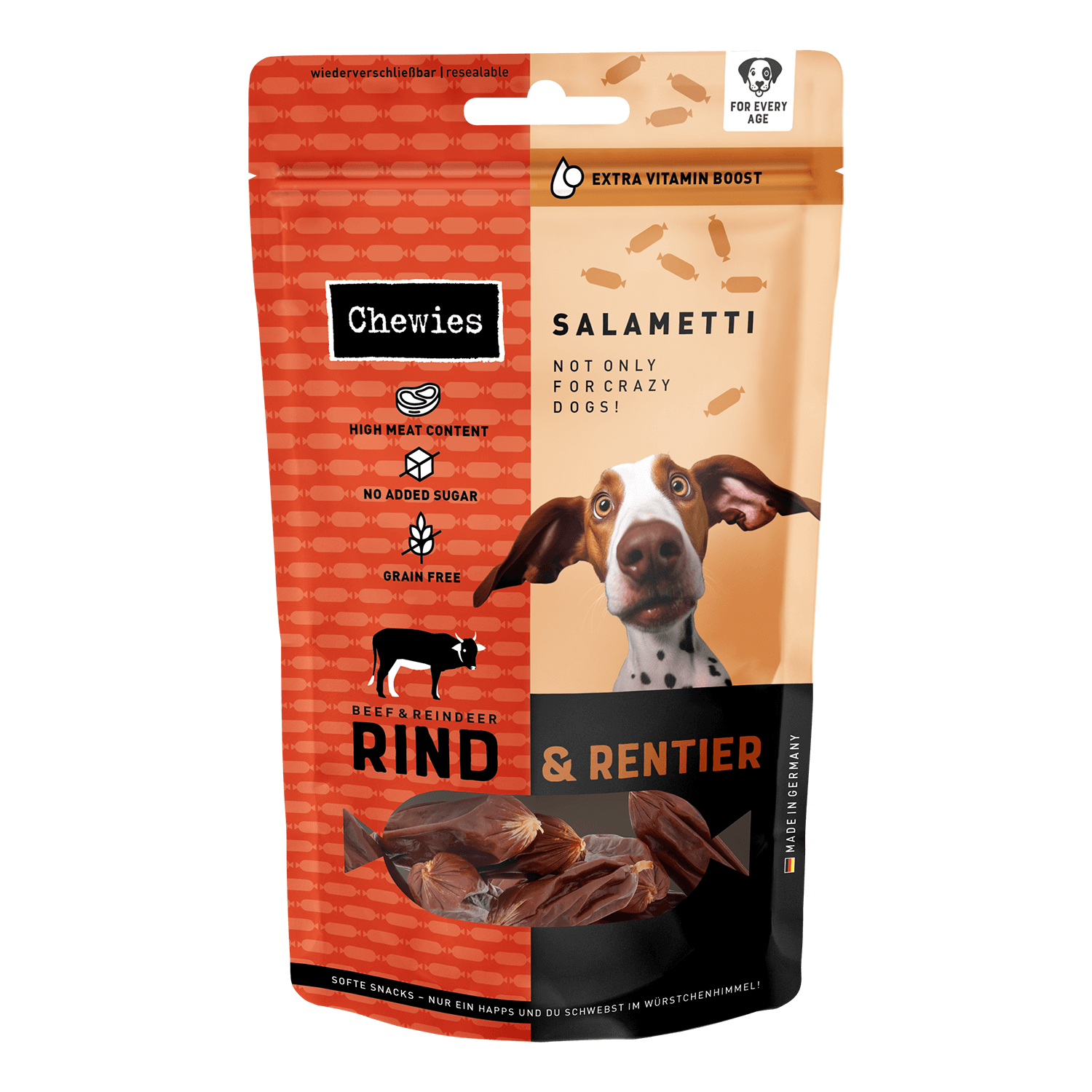 Die Chewies Hundesalami ist der ideale Snack für zwischendurch oder ein praktischer Begleiter beim Hundetraining. Dank ihrer weichen Konsistenz sind die kleinen Würstchen besonders leicht zu kauen und somit perfekt geeignet für Hunde jeden Alters – von Welpen bis zu älteren Vierbeinern.
