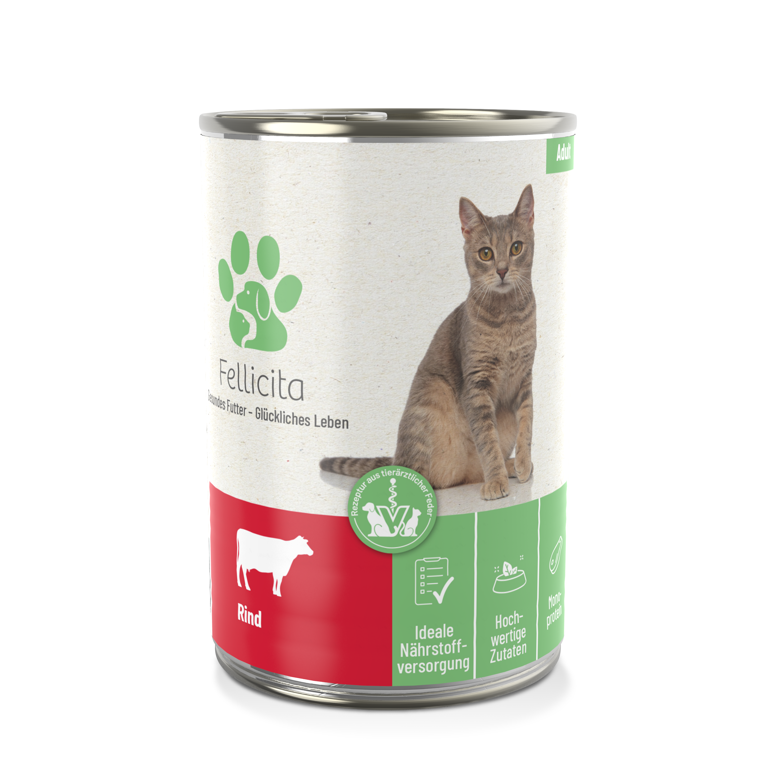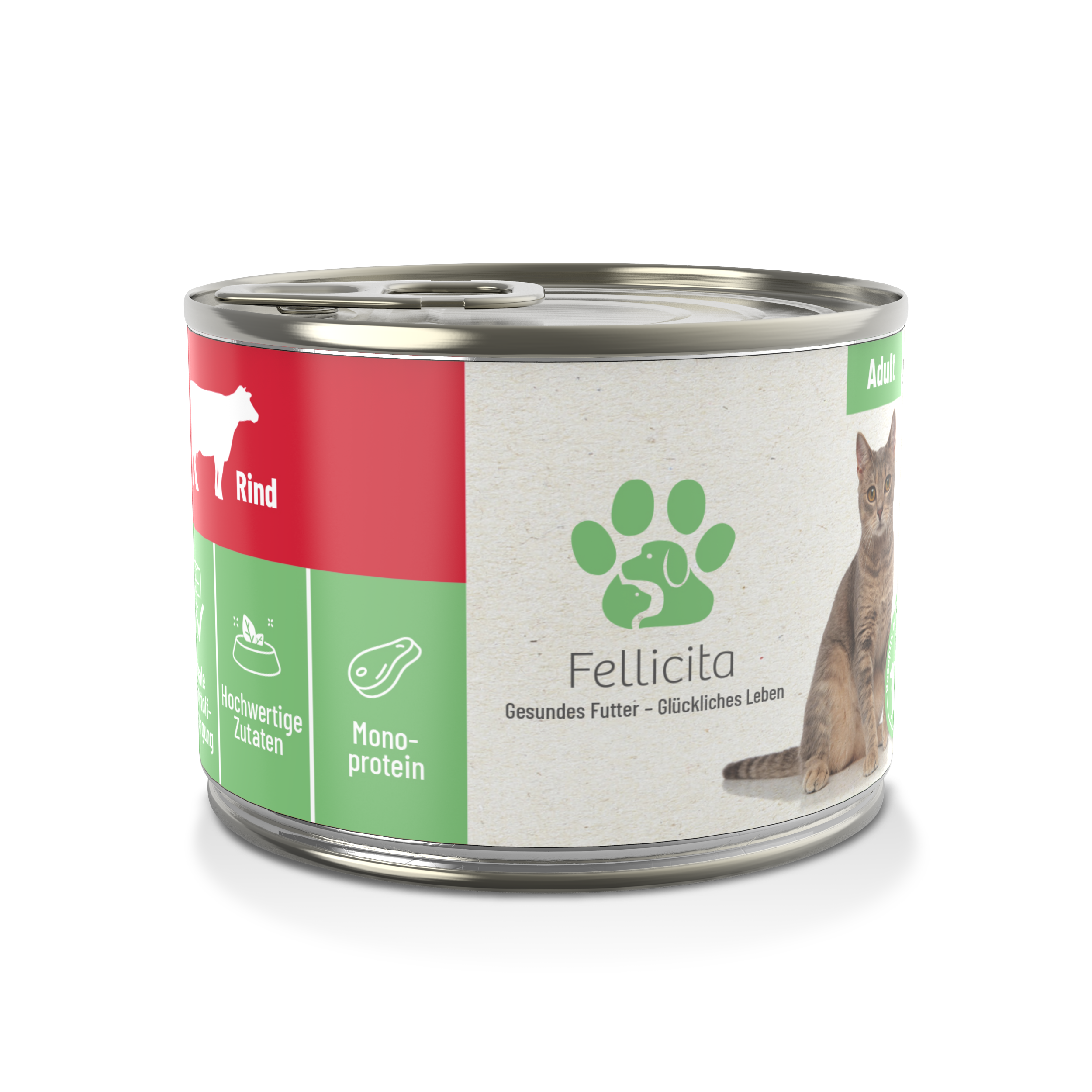 Fellicita: Gesundes Futter – glückliches LebenRind pur - Die besonders leckere FeinkostFellicita in Kürze:Konsistenz: besonders leckere weiche PasteteMonoprotein – nur eine FleischsorteHergestellt aus sorgfältig ausgewählten RohstoffenBedarfsgerechte Nährstoffversorgung für erwachsene KatzenRezepturkonzept: Fleisch, Innereien, MineralstoffeAusgewogenes Calcium-Phosphor-Verhältnis 1,2 : 1GetreidefreiOhne künstliche Aroma-, Farb- und KonservierungsstoffeDie Konservierung erfolgt durch Erhitzung in der verschlossenen Dose.Die Sorte Rind ist in 200 g und 400 g Dosen erhältlich.Verloren im Futterdschungel? Welches Futter ist wirklich mit hauseigenem Sachverstand und Expertise entwickelt? Bei Fellicita können Sie sicher sein, dass die Rezepturen für Katzen und Hunde aus tierärztlicher Feder nicht nur einmalig nach FEDIAF-Standards konzipiert wurden, sondern auch laufend gemäß aktuellen wissenschaftlichen Erkenntnissen überprüft werden. Das Sortiment umfasst Mono- und Multiprotein-Nassfutter mit kurzer Zutatenliste und transparenten Rezepturkonzepten; hergestellt in Deutschland. Die besonders leckere, weiche und feine Pastete überzeugt auch Gourmet-Katzen. Tierfreunde vertrauen Fellicita, denn: gesundes Futter – glückliches Leben!