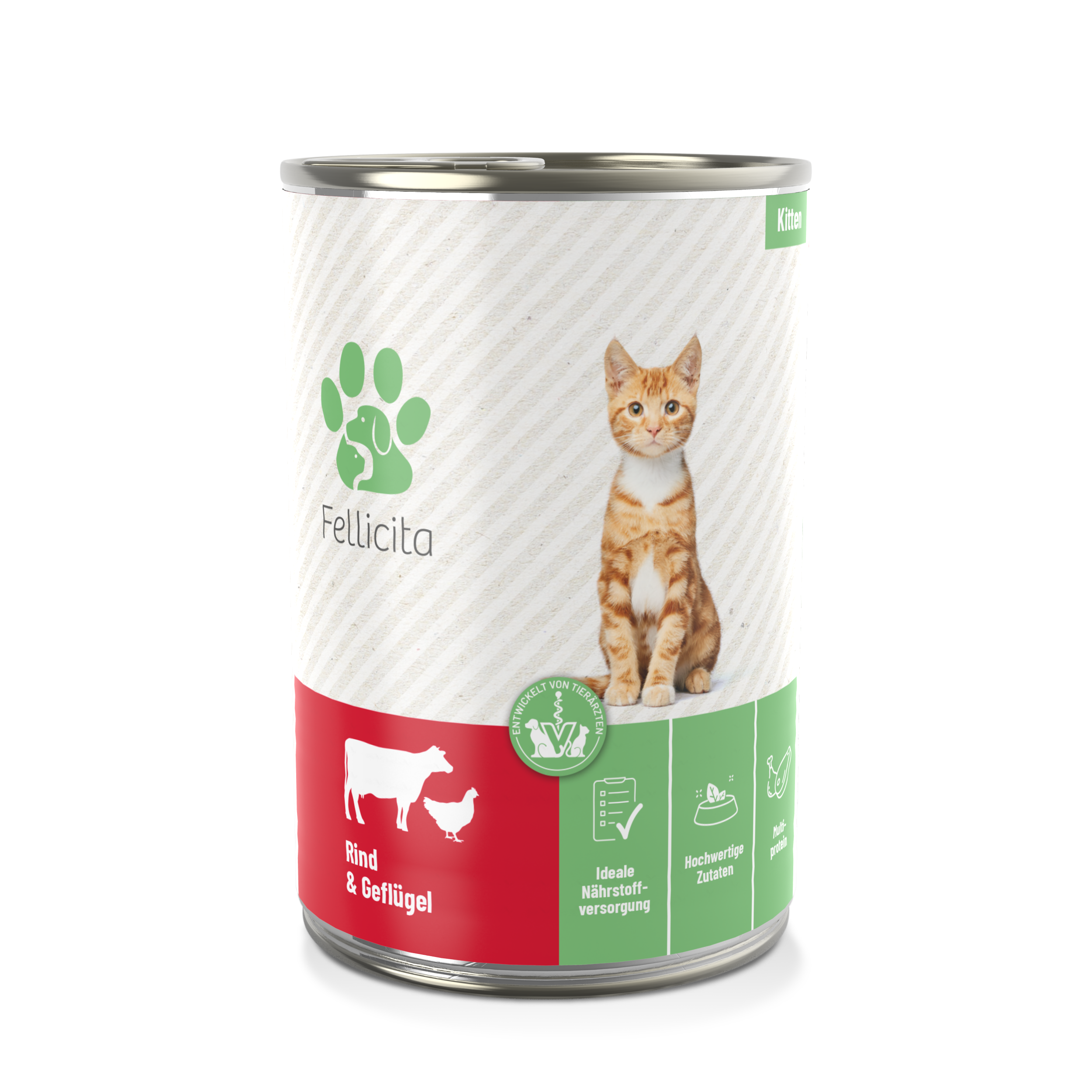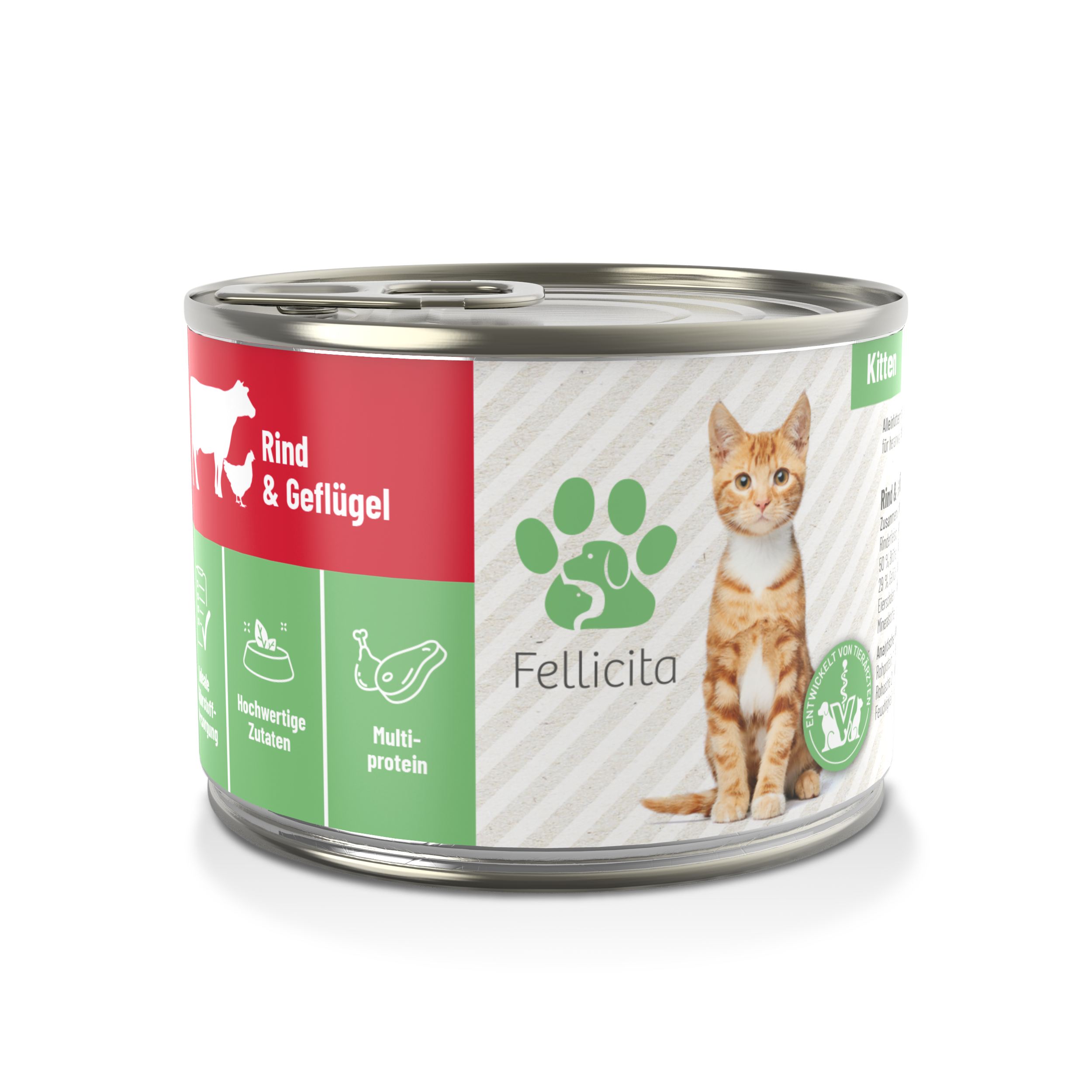 Fellicita: Gesundes Futter – glückliches LebenRind & Geflügel für Kitten - Die besonders leckere Feinkost für Ihre KatzenkinderFellicita in Kürze:Konsistenz: besonders leckere weiche PasteteMultiprotein – Mix aus zwei FleischsortenHergestellt aus sorgfältig ausgewählten RohstoffenBedarfsgerechte Nährstoffversorgung für heranwachsende KatzenRezepturkonzept: Fleisch, Innereien, MineralstoffeAusgewogenes Calcium-Phosphor-Verhältnis 1,2 : 1GetreidefreiOhne künstliche Aroma-, Farb- und KonservierungsstoffeDie Konservierung erfolgt durch Erhitzung in der verschlossenen Dose.Die Sorte Rind & Geflügel für Kitten ist in 200 g und 400 g Dosen erhältlich.