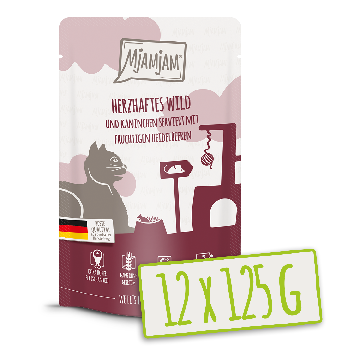 MjAMjAM - Quetschie - herzhaftes Wild & Kaninchen an fruchtigen Heidelbeeren 12x125g