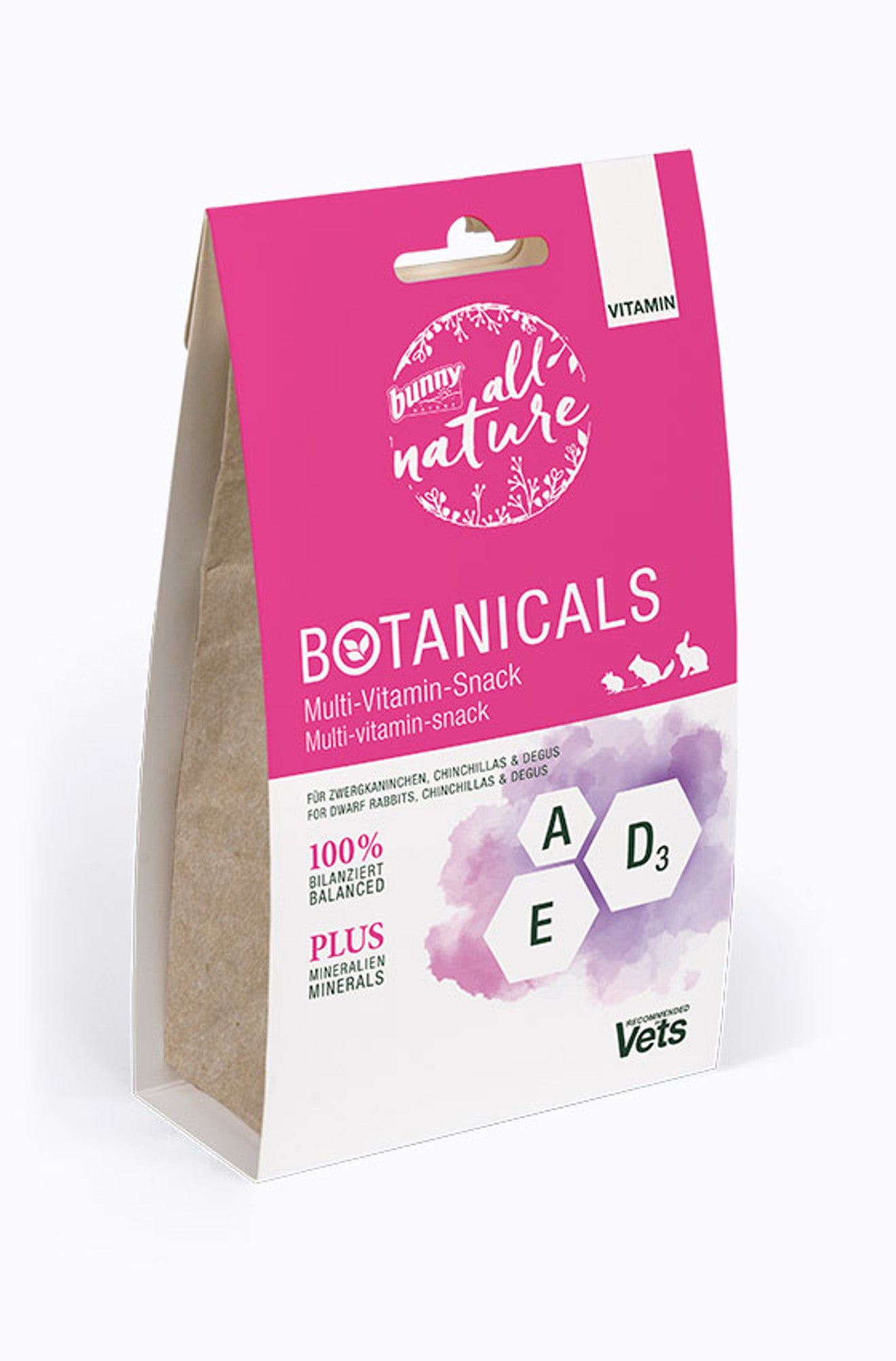 Multi-Vitamin für Kaninchen, Chinchillas und Degus. Zu dem balancierten Futterkonzept »all nature« gehört als wichtiger Baustein der Multi-Vitamin-Snack. Er sorgt für die Sicherheit, dass die Tiere täglich mit allen notwendigen Vitaminen- und Spurenelementen versorgt sind. Der Multi-Vitamin-Snack gleicht Vitaminschwankungen aus, denn Mutter Natur sorgt, z.B. je nach Wetterlage für unterschiedliche Vitamin- und Nährstoffgehalte in allen pflanzlichen Komponenten.