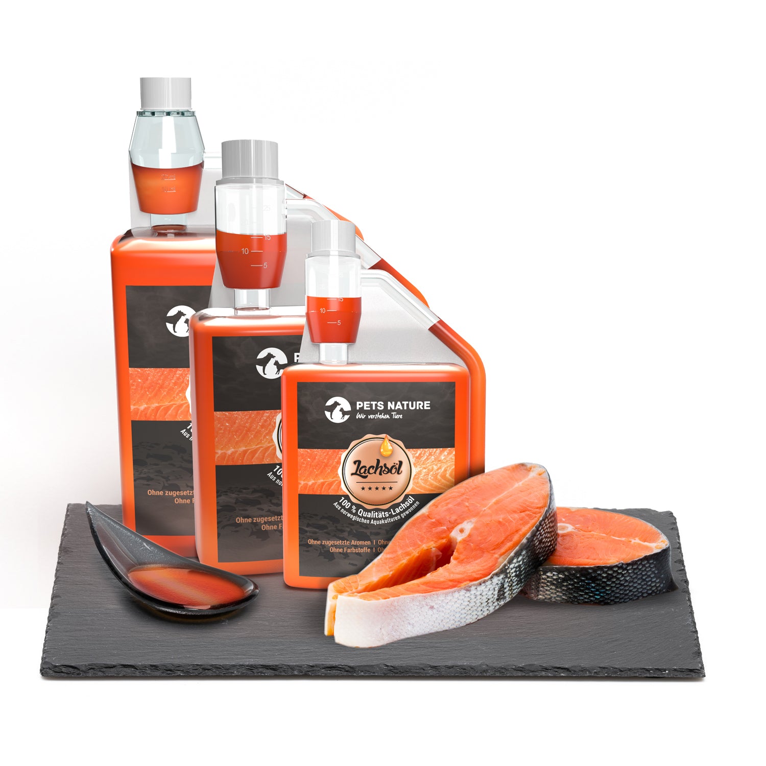 Viele Hunde und Katzen lieben den intensiven Geschmack von Lachsöl. Du kannst damit die Mahlzeit deines Lieblings verfeinern und ihm eine große Freude machen. Doch unser hochwertiges Öl kann noch mehr! Es kann einen positiven Einfluss auf das Wohlbefinden deiner Fellnase haben. Es trägt zu einer normalen Körperfunktion und zum Erhalt eines normalen Haarkleids bei. Unser Premium-Lachsöl von norwegischen Lachsen ist naturrein und sehr hochwertig, denn uns liegt deine Fellnase am Herzen. Es besteht aus 100 % schonend gewonnenem Lachsöl und ist reich an gesättigten und ungesättigten Fettsäuren. Davon sind einige für Hunde und Katzen essenziell.