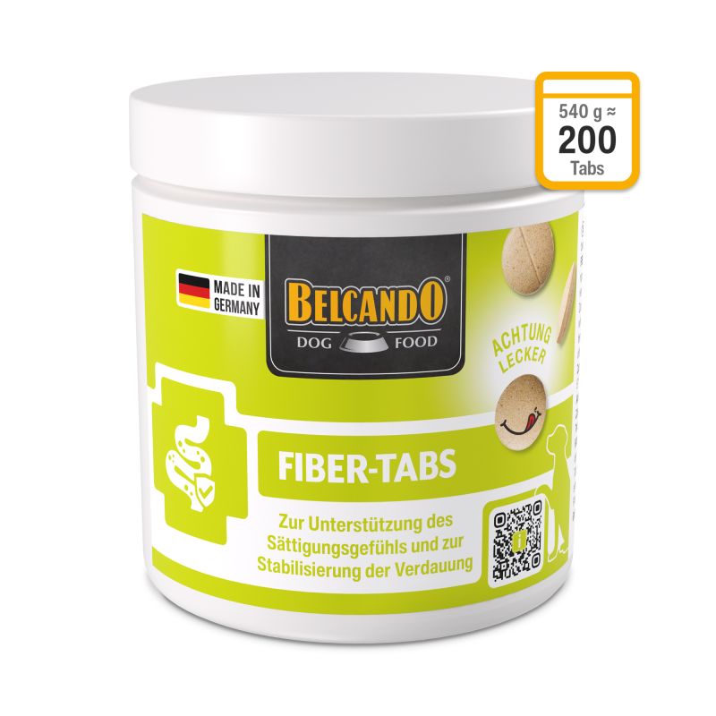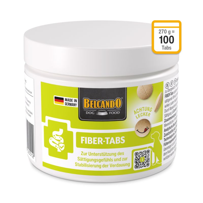 FIBER-Tabs ergänzen die Versorgung des Hundes gezielt mit einer ausgewogenen Kombination von Ballaststoffen, die für ihre regulierende Wirkung auf die Verdauung und ihre sättigende Wirkung bekannt sind. Unlösliche Ballaststoffe enthalten keine verwertbare Energie und reduzieren somit bei Zufütterung die Energiedichte der Gesamtration. Sie wirken zudem festigend auf den Darminhalt. Lösliche Ballaststoffe werden teilweise von Darmbakterien verstoffwechselt und können prebiotisch auf die Darmflora wirken. Durch Wasserbindung verlängern Ballaststoffe die Transitzeit des Darminhaltes und können so die Kotkonsistenz positiv beeinflussen. Eine hohe Quellwirkung fördert zudem die Sättigung. L-Carnitin hat eine wichtige Aufgabe im Fettstoffwechsel und ist daher unverzichtbar bei der Mobilisation von Fettreserven.
