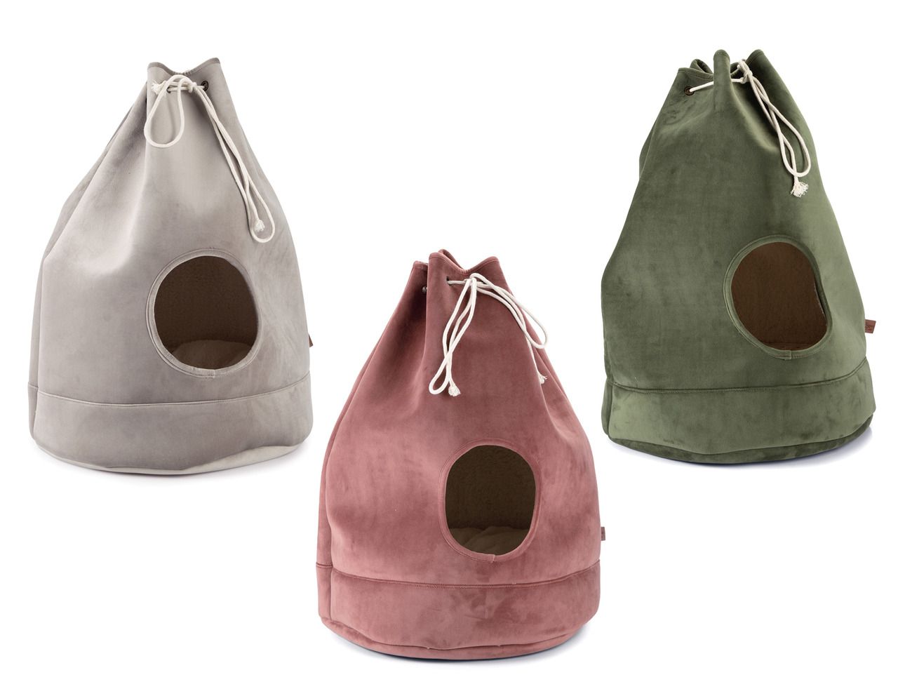 Die Gestaltung ist an das Design eines Beutels angelehnt, der am oberen Ende mit einem Band geschlossen wird. Durch die vordere Öffnung schlüpft die Katze ins Innere und kuschelt sich dann auf dem weichen Kissen ein.