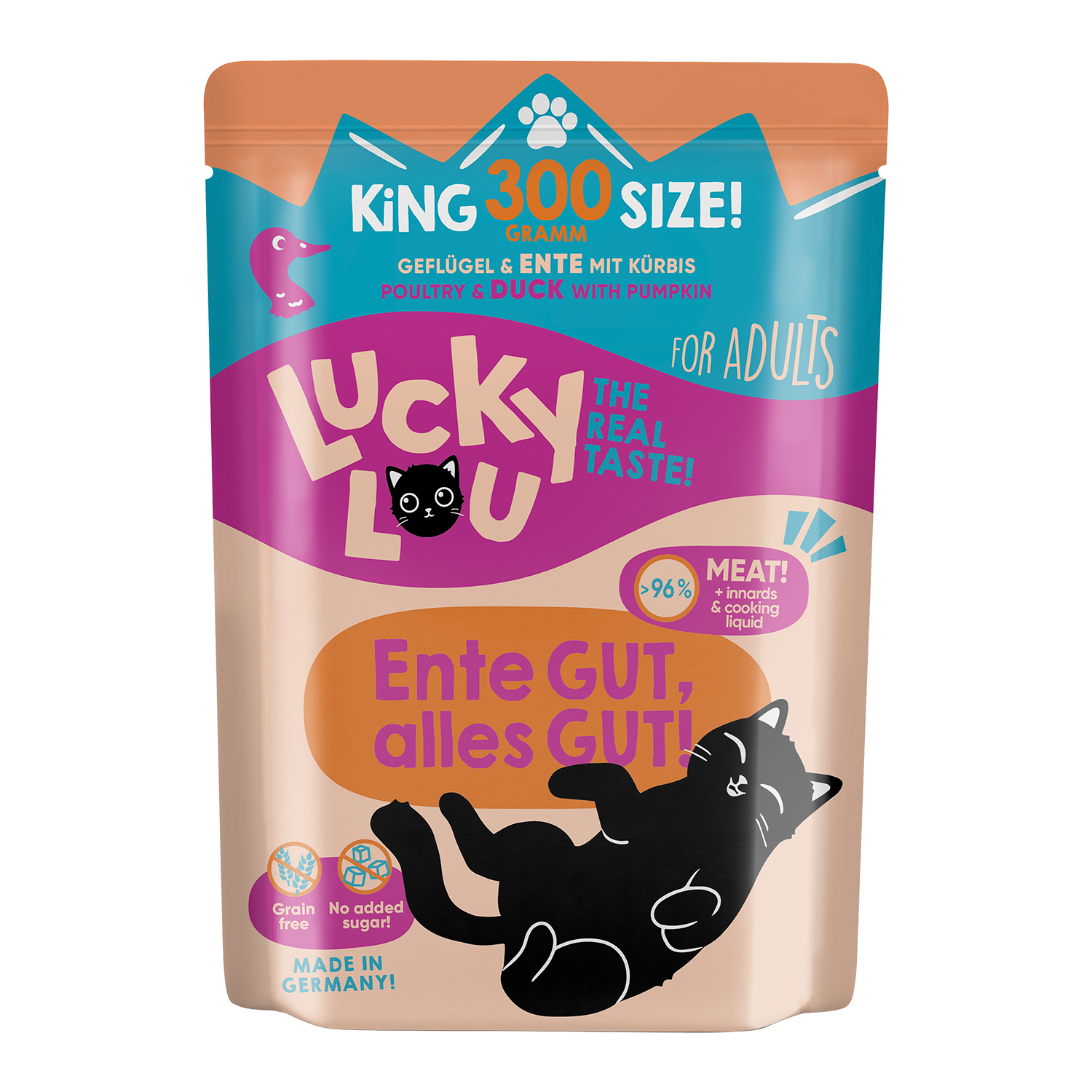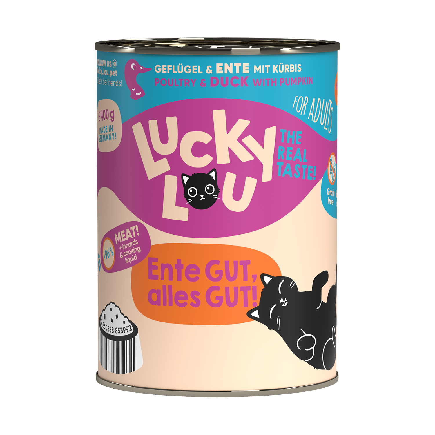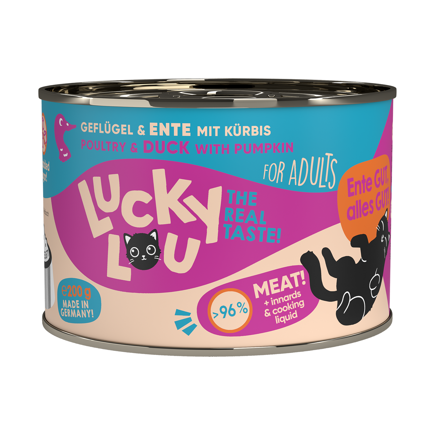 Lucky Lou Lifestage Adult Geflügel & Ente ist ein hochwertiges, getreidefreies Nassfutter für ausgewachsene Katzen, das optimal auf die natürlichen Bedürfnisse deiner Samtpfote abgestimmt ist. Inspiriert vom Beutetierprinzip enthält es viel tierisches Protein, wertvolle Mineralstoffe, pflanzliche Rohfasern und einen kleinen Anteil hochwertiger Öle – für eine artgerechte Ernährung.
