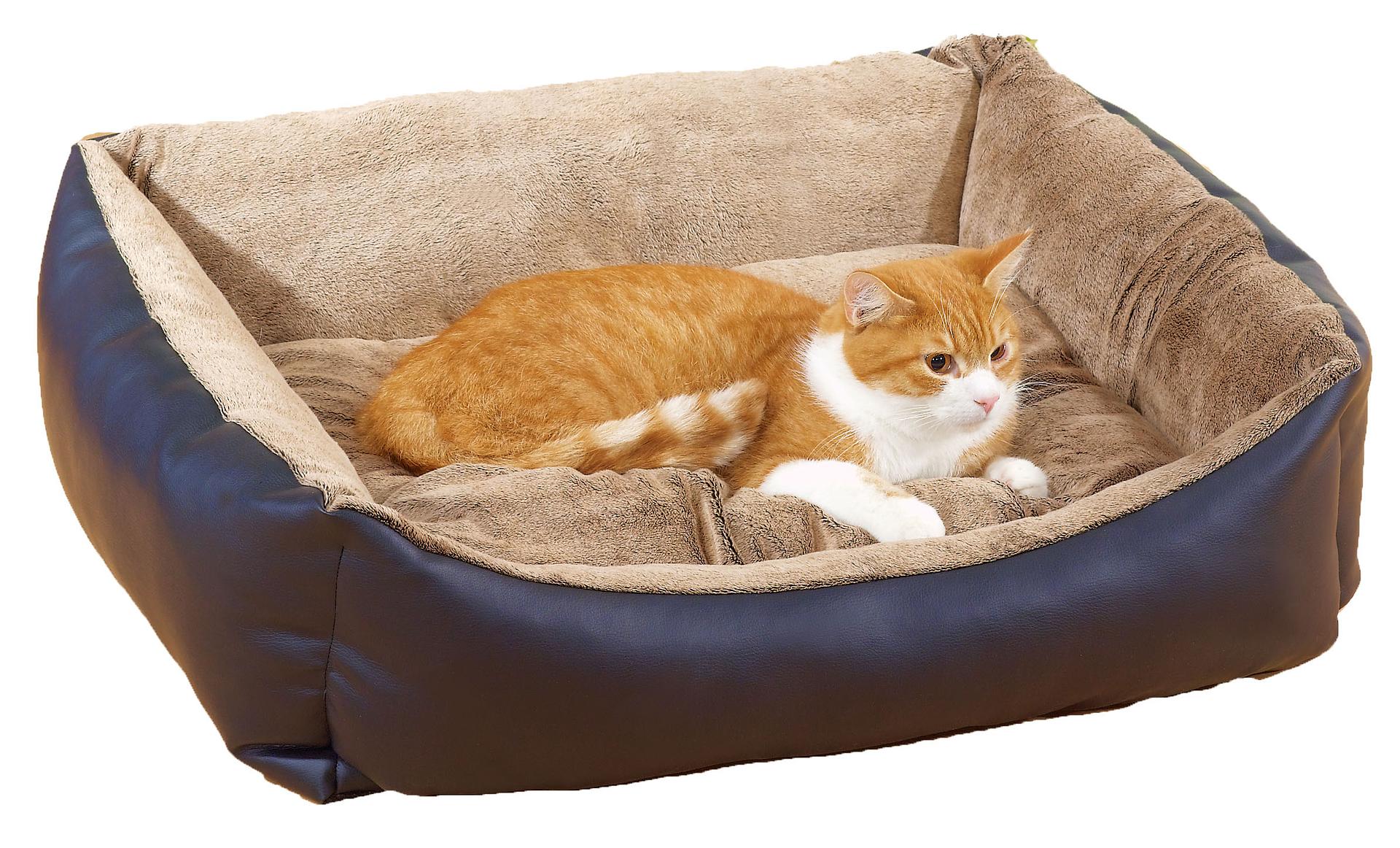 Gemütliches Kuschelbett, außen aus schickem Kunstleder und innen mit weichem Velours. Das Kissen ist wendbar und kann herausgenommen werden.