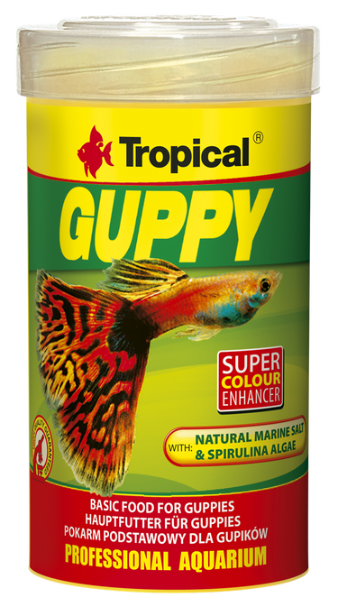 GUPPY ist ein Basisfutter mit Meersalz für Guppys. Das zutatenreiche Flockenfutter ist für die tägliche Fütterung von Guppys und anderen lebend gebärenden Fischen.