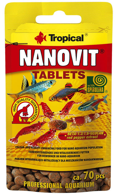 TROPICAL NANOVIT TABLETS sind farbverstärkende, winzige, plan-konvexe (linsenförmige) Tabletten, mit einem hohen Gehalt an natürlichen Carotinoiden und einem 14%igen Anteil an Spirulina zur täglichen Fütterung von Fischen in Nano-Aquarien.
